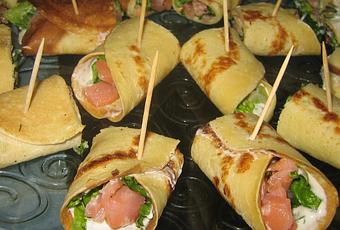 Pour l'apéritif, voici une recette sympa de mini bouchées ou wraps à base de crêpe, saumon fumé, épinard et fromage blanc à l'aneth.