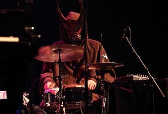 Lambert ouvre cette soirée. Il monte sur scène masqué ; il est accompagné sur cette tournée d’un batteur, lui aussi portant un masque aux cornes en forme de cercle évoquant lui aussi quelque bovin. L’ambiance est onirique ce soir lorsque les notes de piano résonnent dans le théâtre yverdonnois. On notera l’utilisation intelligente de la salle : en effet, les deux musiciens sont éclairés à contrejour si bien que les ombres de leur masque sont projetées sur les côtés de la salle sur les arcades des côtés de la salle.