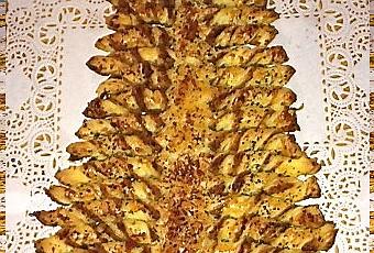 - Pour le haut du sapin, découper dans les chutes de pâte deux triangles qui viendront compléter le haut de l'arbre. Procéder comme pour le reste et souder le haut avec le bas du sapin en mouillant les pâtes avec le jaune d'oeuf.