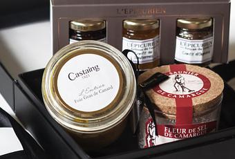 Composition du coffret : Fleur de sel Le Saunier de Camargue – boite ronde 150g, Coffret de 3 confits L’Epicurien – 3 pots de 45g, Foie gras Maison Castaing – pot de 180g Prix de vente : 59,90€ TTC