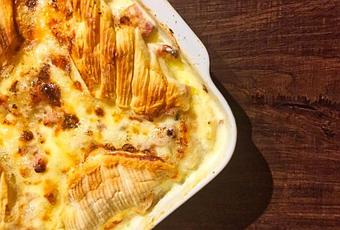Une fois les pommes de terre cuites, recouvrir le fond du plat de des pommes de terre, puis ajouter le mélange oignons et lardons par-dessus.