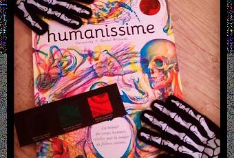 « Humanissime » présente les 10 principaux systèmes du corps humain : – le corps humain dans son ensemble, – la tête, – les yeux et les oreilles, – la bouche et le nez, – le cœur, – les côtes et les poumons, – l’abdomen, – la grossesse, – les bras et les mains, – les jambes et les pieds. Chaque chapitre est composé de 3 doubles pages. La première présente les informations clés. La deuxième nous emmène dans la salle de radiologie pour observer tour à tour le squelette, les muscles et les organes grâce aux trois filtres de couleur (vert, rouge et bleu). La 3e double page, la salle d’anatomie, propose le détail de ce qui a été vu précédemment, sous forme de planches et de fiches.