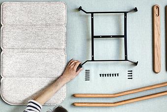 La chaise Paddock a été développée dans un matériau sandwich avec 4 planches de bois courbées aux extrémités, recouvertes d’une mousse et réunies par un tissu épais. Elle apporte à la fois souplesse et rigidité. Une fois posé sur la structure, ce futon articulé prend forme créant une assise ergonomique et confortable.