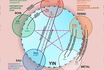 Dans l'illustration ci-contre, qui représente un aspect important de la cosmogonie chinoise, telle qu'elle existe depuis longtemps et qui décrit le cycle des éléments, de la nature, en général et chez l'humain, en particulier, l'élément de l' EAU arrive directement après l'élément du MÉTAL . L'élément du MÉTAL correspond au Petit Yin , à l'amorce de la descente de l'énergie, qui est une énergie de condensation, de contraction, dont l'apogée inversée ( Grand Yin ) vers le bas correspond au silence , à l'introversion, à la lenteur , au repos , à la régénération , au ressourcement , à l'hibernation et à la vie qui s'assume. Les astres, le Soleil en particulier, ainsi que la position de la Terre sur son axe font en sorte que l'élément EAU EAU SHAO YIN est une énergie cosmique qui se déplace dans le cosmos et se dirige vers la Terre pour manifester ce que nous appelons les légumes d'hiver (poireau, courge d'hiver, céleri) . Cette énergie cosmique dont les vibrations correspondent à la couleur bleue se condense dans et à la surface de la Terre pour nous donner justement les aliments dont nos Reins ont besoin en ce temps de l'année. Cette énergie cosmique, qui émane entre autres de la planète Mercure, arrive sur la Terre accompagnée de caractéristiques qui lui sont propres : la couleur bleue , le froid , la mort des plantations, la saveur salée , celle des éléments provenant de la mer entre autres, la sensation