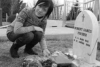 Quel est le nom de cette joueuse chinoise posant des fleurs sur la tombe de Bobby Fischer, le champion du monde d'échecs 1972 ?