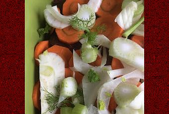 Classiquement c'est carotte, oignon, échalotes et bien entendu un Bourgogne, sinon il faudra débaptiser le plat, qui doit recouvrir la viande. J'ajoute un peu d'huile olive au basilic, du fenouil et c'est plutôt un oignon rouge que je choisis.