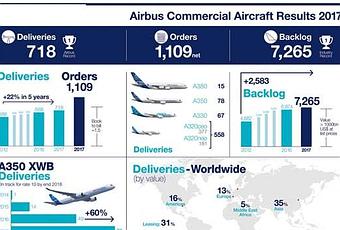 Toulouse, 15 janvier 2018 - Les livraisons d'Airbus Commercial Aircraft réalisées en 2017 ont augmenté pour la 15 ème année consécutive, atteignant un nouveau record de 718 appareils livrés à 85 clients. Ce nombre de livraisons est supérieur de plus de quatre pour cent au record précédent atteint en 2016, avec 688 appareils. Le total des livraisons réalisées en 2017 est constitué de 558 monocouloirs de la famille A320 (dont 181 A320neo - une augmentation de 166 pour cent par rapport à 2016), 67 A330, 78 A350 XWB (près de 60 pour cent de plus qu'en 2016), et 15 A380. Cette excellente performance en matière de livraisons annuelles se double d'un très bon résultat au niveau des prises de commandes. Ainsi, Airbus a enregistré plus de 1.109 nouvelles commandes passées par 44 clients. Fin 2017, le carnet de commandes global d'Airbus comprenait 7265 appareils d'une valeur de 1059 milliards de dollars aux prix catalogue.