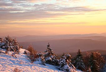Peu à peu, la neige se teinte d'une lumière chaude et rosée alors que l'horizon devient incandescent. C'est l'instant magique où le soleil se prépare à disparaitre pour laisser la place à l'obscurité.