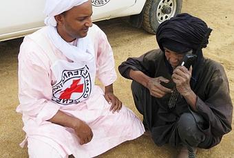 Kidal, Mali. Le CICR facilite le rétablissement des contacts entre membres de familles dispersées. Ici, un père appelle son fils parti en Algérie pour fuir les violences dans la région de Kidal. Photo : CICR – M. Ben Abdallah