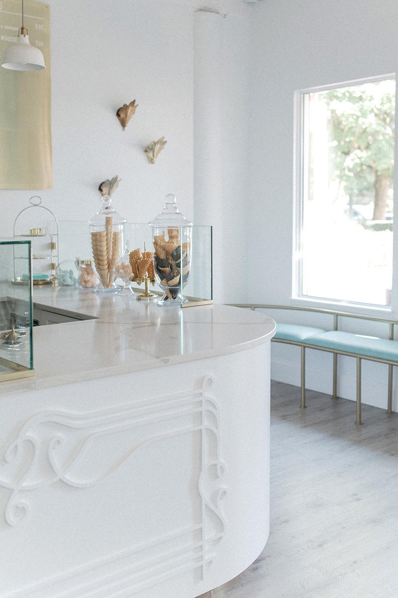 Le studio Arithmetic est intervenu sur la conception intérieure globale, la conception du mobilier, l’image de marque, le packaging, l’art mural, la direction artistique, la tenue du personnel, et l’expérience émotionnelle luxueuse de la marque La Glace.