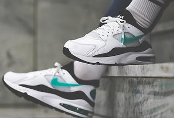 Anecdote plutôt méconnue de ce design, c’est en s’inspirant d’une poignée d’un pichet à lait que Tinker Hatfield eu l’idée d’ouvrir l’unité Air du talon. Cette large unité Air lui a ainsi value le surnom de 270 en interne, surnom que la Air Max 93 a humblement laissé à la dernière née de la ligne Air Max. La paire reviendra donc dès cette semaine dans son coloris OG symbolisé par une association de blanc et noir aux côtés de détails turquoise, dont un imposant Swoosh. Cette Air Max 93 se structure par une association de cuir et de textile aux côtés d’un large col en néoprène, une révolution pour l’époque.