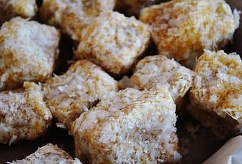 * Pour réaliser la sauce, on peut aussi utiliser un sachet de sauce à poutine et du bouillon de poulet du commerce.** Les flocons de pommes sont couramment appelés patates Shirriff's. Ce sont des pommes de terre déshydratées et mise en flocons sur une base commerciale.