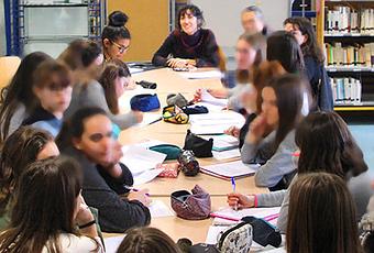 Deux heures à nouveau de travail avec les lycéens, ce vendredi 2 février. Cette fois-ci, c'était Myriam Saligari, auteur de Il était temps, chez Elan Sud, collection élan d'elles, et participante au Prix première chance à l'écriture de cette année avec son 2e manuscrit La Pomme d'Ève, qui répondait aux nombreuses questions des lycéens en compagnie de Véronique Ruiz, professeurs de lettres, Corinne Niederhoffer, éditrice, et Dominique Lin, auteur. Chacun a apporté son point de vue dans la conversation en complément des réponses de Myriam.