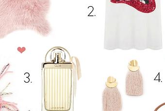 1. Aquazzura, powder puff pompom pump, 1,035.67 $2. Chloé, fragrance Chloé Love Story, 122$ (50ml), 154$ (75ml)3. Bouclair, tapis simili-fourrure, 50$4. Choies, t-shirt, 26,99$5. Lizzie Fortunato, crater earrings 231,79$