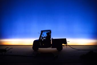 Une mise en scène épurée, mais loin d'être pauvre, qui n'hésite pas à poser sur le plateau un hybride entre voiturette de golf et tracteur, studio mobile du " Bruit des Combrailles ", une webradio locale. L'émission capte les bruits environnants à la périphérie des villes et des campagnes et fait entendre le monde autrement à ses populations.