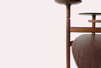 Entre table d’appoint et table basse mixe l’érable et noyer en appliquant leur couleur afin représenter la fleur et la racine du lotus. Le corps principal de la table d’appoint est constituée de tables rondes de tailles différentes disposées à différents niveaux.