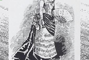 Robe à tournure à motifs musicaux ornée d'instruments de musique qui relèvent audacieusement la tournure au niveau des anches. Une caricature de W. Morgenstern publiée en 1888 dans les Lustige Blätter.