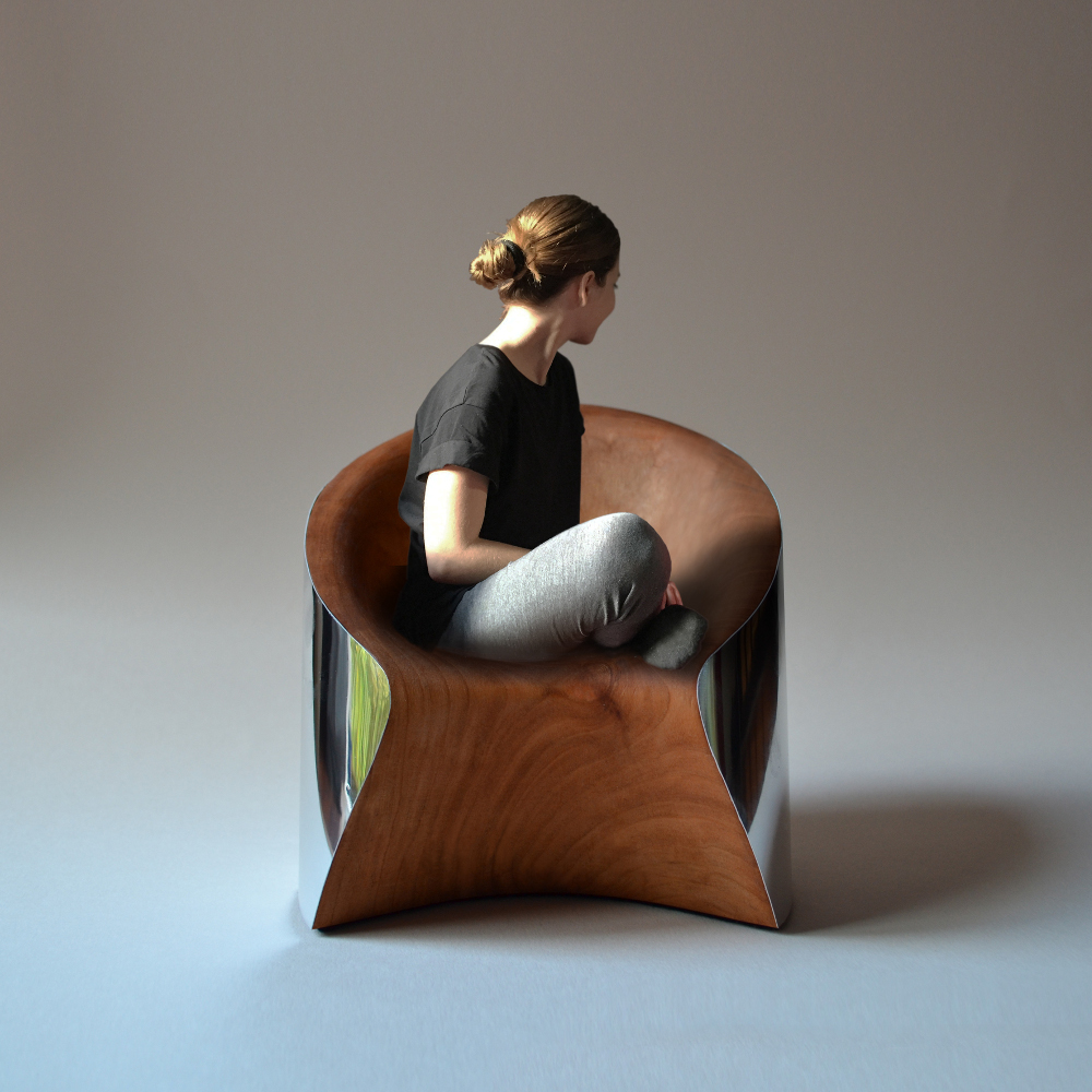 « Le métal réfléchissant sur les meubles capture l’espace environnant, il est différent de tous les angles et fait des effets visuels intéressants. Le corps ne fait que toucher le bois intérieur en position assise, offrant une chaleur naturelle et un touché confortable. »
