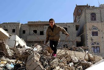 Ibrahim, 10 ans, se fraye un chemin entre les décombres d’un bâtiment détruit par des frappes aériennes à Sanaa. Photo : EPA /Yehia Arhab