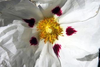 Cistus ladanifer (Ciste à gomme) : arbrisseau cultivé et naturalisé sur le pourtour méditerranéen ; 3 sépales, pétales blancs tachés de rouge à la base.