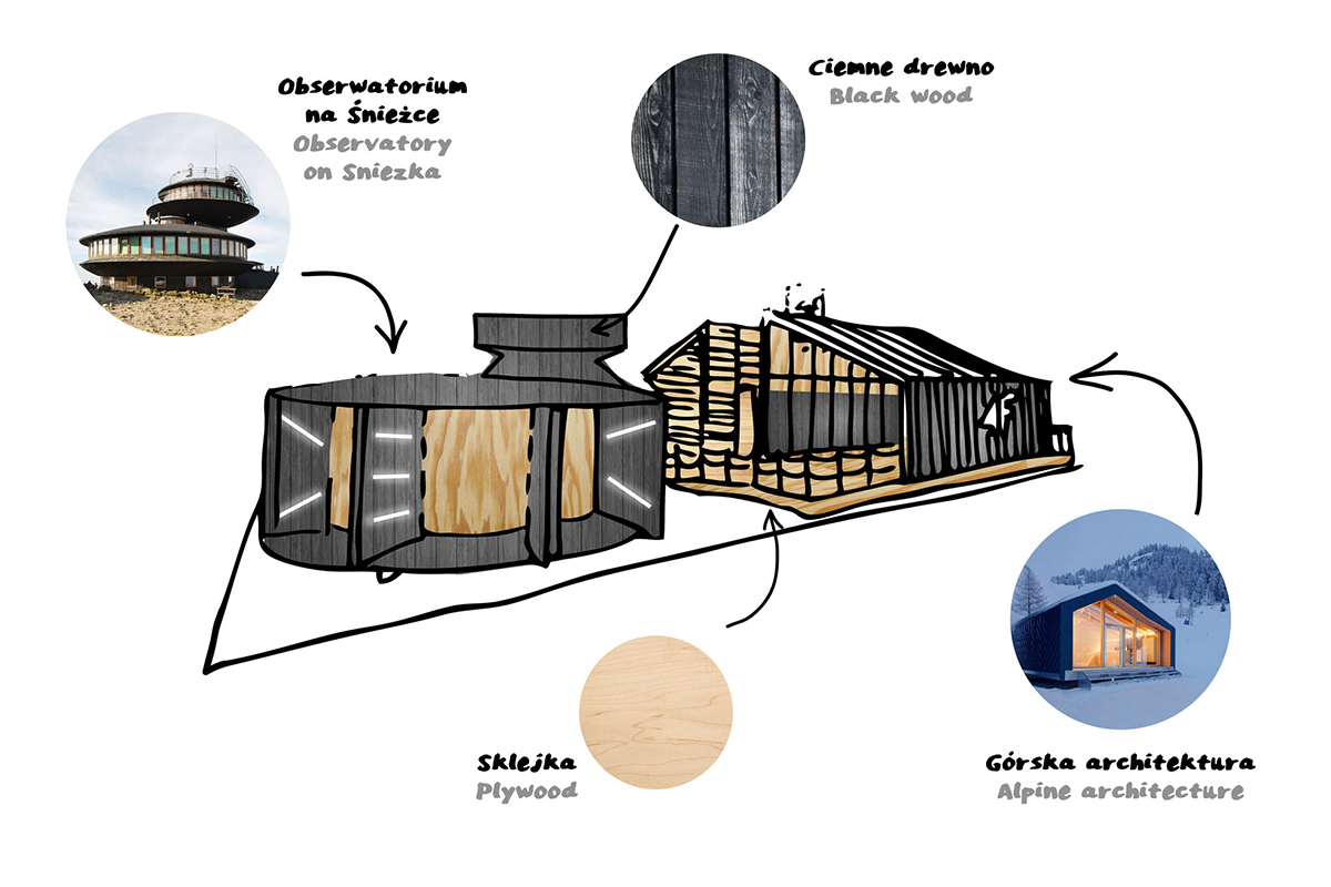 Le point principal se situait dans une construction inspirée de ces refuges modernes. Il se compose de deux cabines aux toits aux caractéristiques inclinées. La façade était couverte de bois foncé, souvent vu dans l’architecture de montagne traditionnelle. Les murs intérieurs étaient, au contraire, bordés de contreplaqué de pin, pouvant mener à cette sensation chaleureuse.