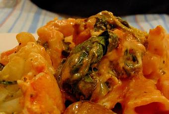 Il s'agit de pâtes et de légumes (brocoli, chou-fleur et champignons) dans une sauce rosée.