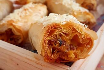 - Badigeonner chaque bande de feuilles de filo de beurre. Placer au bord un boudin de pomme de terre et enrouler sur lui même.
