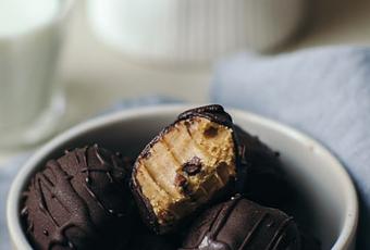 - 4. Lorsque les boules ont reposé, faire fondre au bain-marie le beurre de cacao avec le nectar de coco et la poudre de cacao cru. Retirer du feu lorsque la ganache est homogène et onctueuse, puis ajouter une goutte d'huile essentielle de menthe poivrée et mélanger.