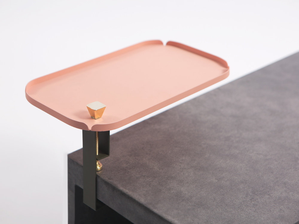 Réalisé en métal, chaque élément se jouant des couleurs du moment, entre rose et vert viennent par pincement vous proposer un espace de rangement sous forme d’un plateau, ou une lampe.