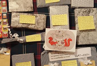 Les circonstances de ce swap étaient particulières ; je devais recevoir le colis de Lili sur mon lieu de vacances, au ski ! Nous craignions qu’il n’arrive en retard, en raison de la masse de neige qui était tombée ces jours-là. Finalement, la Poste a été très rapide (allons, allons, ne faites pas de mauvais esprit, ce n’est pas un oxymore). Mais peut-être était-ce le Père-Noël lui-même qui est venu me déposer le colis en traîneau… Car voyez vous-même comme c’était magique : dans ce colis il y avait une avalanche de cadeaux artistiquement emballés dans du papier noir & blanc très graphique. Gâteau sous la cerise, Lili avait poussé la délicatesse jusqu’à coller des petits post-it commentant, sans le révéler, le contenu de chaque paquet… Sacré sens du teasing ! De quoi faire du déballage une pure partie de plaisir ! (Et elle était bien méritée, croyez m’en, après une journée à traîner mes filles en luge 🤪 #compensation).