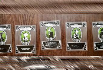 Petit plus du jeu, les épitaphes des pierres tombales. En effet, en haut de la carte des personnages, il y a leur nom. Et grâce à la transparence des cartes, leur mort s’affiche et elle est différente pour chaque cartes qui va venir se poser dessus, ce qui vous promet des fou-rires incroyables.