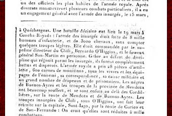 (1) Or les Sud-Américains avaient commencé à rapprocher San Martín de Napoléon, après qu'il avait traversé les Andes, en janvier et février 1817, pour libérer le Chili, retombé en 1814 sous la coupe du vice-roi du Pérou. (2) Cette "surprise de Cancha Rayada" est amplement documentée dans mon livre, San Martín par lui-même et par ses contemporains, que j'ai publiés aux Editions du Jasmin.