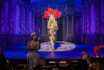 La mise en scène a choisi de systématiquement nous montrer l'envers du décor et propose ainsi à la fois une analyse des moyens mis en oeuvre. Le plateau tournant est utilisé pour nous transporter dans les pauvres coulisses d'un théâtre baroque, on y voit les comédiens à l'habillage et les monteurs transporter ou mettre en place les panneaux qui compartimentent les deux côtés de la scène. La mise en abyme du théâtre dans le théâtre est constamment soulignée, Stefan Herheim y insiste, dévoile les artifices de l'illusion, décortique les procédés du comique. Ce parti pris empêche l'identification du public aux personnages dont on sait à chaque moment qu'ils sont des acteurs en train de jouer leur partie, on est ici conviés à jeter un regard amusé sur le monde du théâtre de représentation. Cet incessant décodage nous place aux antipodes du théâtre romantique. Les effets grossissants du grotesque sont privilégiés: toiles grossièrement peintes des décors, comédiens déguisés en grands moutons bêlants visiblement en rut, costumes de soldats emplumés et enjuponnés, recherche d'effets grotesques.Si quelques-uns des airs les plus célèbres sont chantés dans l'original italien, le texte est le plus souvent traduit en allemand, ce qui permet l'introduction d'allusions ou de prononciations régionales qui provoquent l'hilarité du public. La gaudriole rigolarde est au centre de l'action, un moment soulignée par la projection du palindrome du nom du roi, la lecture de XERXES donnant SEXREX, le roi du sexe, tout un programme. On n'est pourtant jamais dans la vulgarité car le regard analytique de la mise en scène sur les moyens du théâtre baroque entraîne une mise à distance qui sauve des mornes errements de la platitude. La rupture des codes est aussi présente dans les interactions entre les musiciens, le chef Konrad Junghänel et les acteurs: les acteurs descendent parfois dans la fosse, interpellent un musicien ou le chef qui leur répond. Et tout à la fin, les membres du choeur, très sollicités pour les changements incessants de costumes, se retrouvent en tenues de ville, les acteurs ont quitté les oripeaux du spectacle, soulignant encore une fois qu'il ne s'agissait que d'un spectacle.