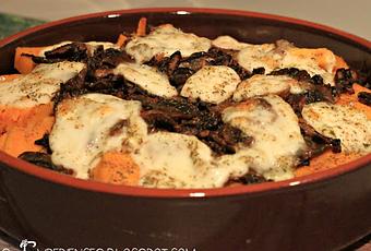Ingrédients 2 patates douces 1 boule de mozzarella 150gr de champignons de paris frais 2 gousses d'ail sel et poivre Cuire les patates douces dans de l'eau salée, environ 30 minutes. Elles doivent être tendres. Éplucher. Couper en rondelles. Pendant ce temps émincer les champignons. Faire revenir l'ail pressé dans un filet d'huile d'olive. Ajouter les champignons et les faire colorer à feu vif.