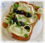 Tartiner légèrement le pain d'huile d'olive. Y répartir les tranches de tomates, les rondelles d'oignon, le piment doux, le fromage de chèvre, les olives. Terminer avec quelques gouttes d'huile d'olive. Parsemer d'herbes aromatiques si on en a.