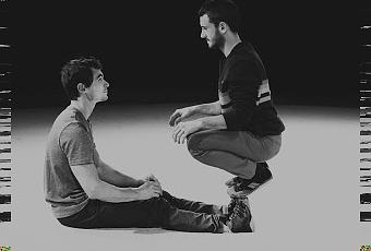 Sur ces mots il va tranquillement s’asseoir et regarde le public d'un sourire peu ordinaire. Sergi Pares arrive, simplement vêtu d'un tee-shirt barré d'un arc-en-ciel et accroche son regard. Les pointes de leurs pieds se frôlent dans un silence absolu. Ça commence entre eux comme un jeu de bac à sable, quand un môme lance un défi à un autre, sans avoir besoin de parler. Les mouvements sont lents et doux, mais on se rend ne compte tout de même qu’aucun de nous ne serait capable de les reproduire. Sergi est accroupi sur la pointe des pieds d'Alexandre. C'est tout et rien que ça c’est déjà de l’équilibre, de l’acrobatie.
