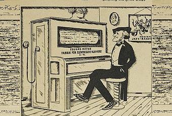 Une caricature wagnérienne de 1926 sur le thème "S'ils vivaient aujourd'hui" montre Wagner au piano électrique de la firme Eduard Meyer. Une affiche vante un jazz-band.