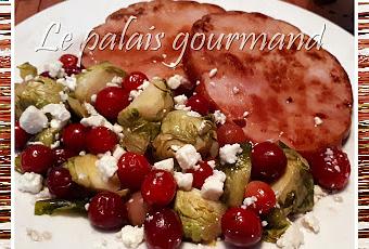 Un bel accompagnement que mon chum nous avait concocté pour le jambon, c'est différent mais très bon. Si vous n'aimez mordre dans la canneberge fraîche à cause de son côté acidulée, vous pourriez remplacer par du séchée et les mettre juste à la fin. La recette vient du site, Well Plated.2 livres de choux de Bruxelles, parés et coupés en deux