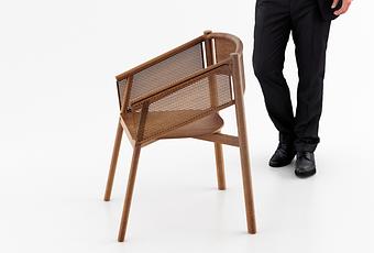 Le point de départ de ma réflexion était cette inclinaison très forte des accoudoirs. Le reste est venu naturellement, il s’agit pour moi d’une réponse esthétique et technique à cette ligne dynamique des accoudoirs. A cela, je souhaitais ajouter une aspérité visuelle, j’ai choisi d’exploiter l’effet de moiré. Il est visible lorsque l’on observe les deux surfaces planes ajourées sous les accoudoirs. »