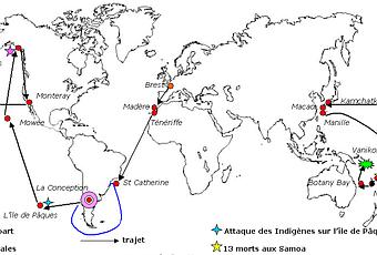 Lapérouse et ses compagnons empruntent une voie connue en direction des côtes brésiliennes. Le 7 février 1786, les deux navires doublent sans difficulté le cap Horn et arrivent le 21 à Concepción, au Chili. Le 9 avril, ils sont à l'île de Pâques et mettent le cap au nord pour arriver le 29 mai dans l'île de Mowee, à Hawaï. Toujours vers le nord, Lapérouse aborde le 23 juin la côte d'Alaska où, le 13 juillet, dans la baie des Français, un premier drame emporte 21 officiers et matelots qui périssent noyés, leurs chaloupes englouties par un violent courant. Lapérouse redescend jusqu'en Californie, où il visite la région de Monterey. Le 24 septembre, il appareille pour traverser le Pacifique d'est en ouest et, le 3 janvier 1787, il arrive à Macao. Après une escale à Manille, la Boussole et l'Astrolabe remettent le cap au nord pour explorer les côtes de Corée et de Tartarie jusqu'au Kamtchatka à l'extrémité orientale de la Sibérie. Ils y parviennent le 7 septembre et le jeune Lesseps débarque pour rentrer en France par la Sibérie et pour rapporter la documentation déjà réunie. Le 29, départ pour une nouvelle traversée du Pacifique, du nord au sud cette fois. Le 9 décembre, Lapérouse mouille à Tutuila, aux îles Samoa, où Fleuriot de Langle et 10 marins sont massacrés par les indigènes, au cours d'une échauffourée. Le 26 janvier 1788, l'expédition arrive en Australie, à Botany Bay où les Anglais, débarqués quelques semaines auparavant, se préparent à fonder Sydney. En février, départ vers le nord, puis escale en Nouvelle-Calédonie. Le 29 janvier le dernier courrier de monsieur de Lapérouse part de Botany Bay, il faudra attendre quarante années pour savoir ce qui lui est advenu.