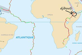 djibouti, paradis des géologues, se situe à la jonction des trois grands rifts, mer rouge, golfe d'aden et est africain, comme indiqué en rouge sur la carte.