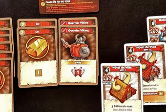 - Joueurs : Chaque joueur joue autant d’action qu’il le souhaite en fonction de sa Main. Vous pouvez acheter des cartes Voie d’Odin, Unité ou Défense, construire des Bâtiments, améliorer votre Hôtel de Ville, attaquer, accomplir une Mission et échanger des Ressources. Attaquer un bâtiment adverse vous rapporte des points de victoire et dans certains cas des récompenses supplémentaires. L’attaquant remporte le combat si sa valeur d’attaque est supérieure ou égale à la valeur de défense du bâtiment. Lors d’une construction placée un jeton Construction sur le bâtiment en question (Cf. photo ci-dessous).
