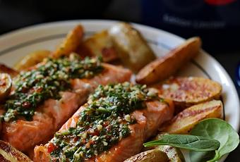 Dresser le poisson dans un plat, ajouter les pommes de terre. Servir avec la sauce façon chimichurri.