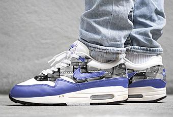 Après une nouvelle version de l’Animal Pack composé de la Air Max 1 et de la Air Max 95, Atmos prépare la sortie d’un pack intitulé “WE LOVE NIKE”. La Air Max 90, la 95 et la One sont à l’honneur. Cette Air Max 1 propose un colorway identique à l’OG Blue, cependant le mesh et le suédé ont été remplacés par du cuir, comme les versions de la fin des années 90 (“Leather SC” edition). La particularité de ce pack, et qui se retrouve sur le medial panel de cette Max 1, est l’imprimé “Shoe Boxes” en noir et blanc. Pour le reste, on retrouve une toe box blanche, un mudguard et un Swoosh Royal Blue, le tout sur une midsole blanche.