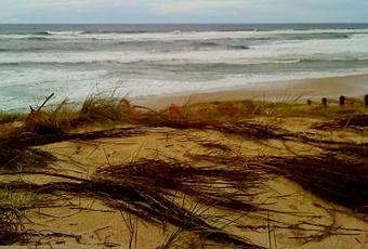 La plage immense balaie sa part d'éternité disputée à la mer, falaise abrupte, érodée, sculpture de sable vivant qui ruisselle tout seul sous un souffle de vent. Vision large, embrumée dans le lointain, vers Vieux-Boucau, sous d'arcs-en-ciel embruns...