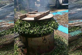 Ensuite, les feuilles sont séchées au soleil pendant trois jours. A trois reprises on les mouille avec le jus du bouillon (je pense que cela enclenche une très légère fermentation, qui donne une très légère aigreur au parfum des feuilles sèches, mais cela ne se ressent nullement après infusion).