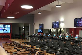 Dans cette chapelle, l’intégrateur a installé des Telefunken 55″ DTM00551M face aux tapis de course. N’étant aujourd’hui plus disponibles, ils sont remplacés par des Philips de la série QL sur les nouveaux projets.