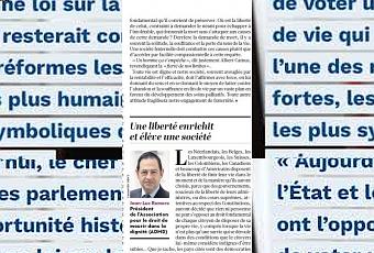 Les Néerlandais, les Belges, les Luxembourgeois, les Suisses, les Colombiens, les Canadiens, beaucoup d’Américains… disposent de la liberté de finir leur vie dans le moment et la manière qu’ils auront choisis, parce que des gouvernements, soucieux de la liberté de leurs administrés, ou des cours suprêmes, soucieuses du respect des constitutions, auront décidé que rien ni personne ne peut s’opposer au droit fondamental de chaque citoyen de disposer de sa propre vie, y compris lorsque la vie n’est plus qu’une survie qui se déroule dans des conditions que le citoyen lui-même considère indignes d’être subies…