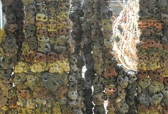 Le titre, c'est Demeure. Faut-il y voir un lien avec la fermeture annoncée de la Maison rouge ? Une demande adressée au fondateur de ce lieu original dans la vie artistique parisienne ? Ou simplement un nom commun, désignant une maison. Lionel Sabatté installe sa construction dans le cube de verre au coeur du bâtiment. Étrange végétation poussant le long de fers à béton, ressemblant à des visages superposés, exprimant, me semble-t-il, toutes celles et tous ceux qui se succèdent dans un immeuble, une maison, une forêt. Car il y a de la forêt dans ces piliers dressés vers le ciel, poussant parfois de manière oblique, soit ruine d'un temps révolu, soit chantier en cours où prendre place.