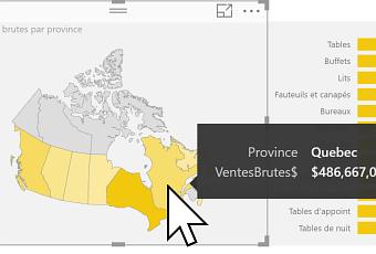Power BI offre depuis longtemps le principe des info-bulles. Plus précisément, lorsqu’un usager passe sa souris sur une information comprise dans une visualisation, on voit une petite fenêtre qui précise l’information en question. Par exemple, ci-dessous, on peut observer grâce à l’info-bulle que les ventes brutes du Québec sont de 486,667,001$.